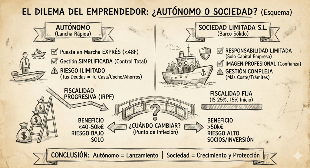 En definitiva, no existe una respuesta única. Empezar como autónomo es una excelente rampa de lanzamiento por su sencillez y bajo coste. Sin embargo, un empresario con visión debe saber identificar el punto de inflexión en el que los riesgos y la carga fiscal hacen imprescindible el «salto» a una sociedad. Analizar la proyección de ingresos y el nivel de riesgo de la actividad son los dos factores clave que, desde una perspectiva de consultoría financiera, determinarán la elección más inteligente para sentar las bases de un crecimiento sólido y, sobre todo, seguro.