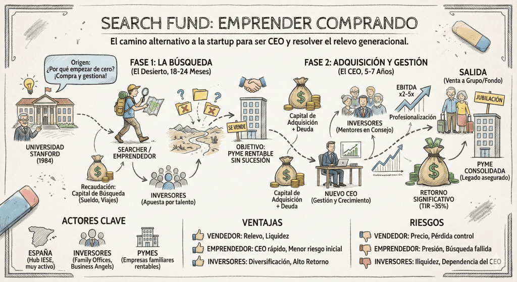 | Inversores (Search Fund) | Retornos atractivos: Las cifras históricas muestran una rentabilidad superior a la de otros activos. Diversificación: Permite invertir directamente en la economía real (pymes). Control y participación: Tienen un rol activo en el consejo, a diferencia de un fondo tradicional. Apuesta por talento gestionado: Invierten en un emprendedor de alto potencial que han validado previamente. | Riesgo del emprendedor: La inversión depende en gran medida de la capacidad de ejecución de una sola persona (el CEO). Activo ilíquido: Es una inversión a largo plazo (5-10 años) sin un mercado secundario fácil. Riesgo de búsqueda fallida: El capital inicial de búsqueda puede perderse si no se encuentra una empresa que adquirir. |