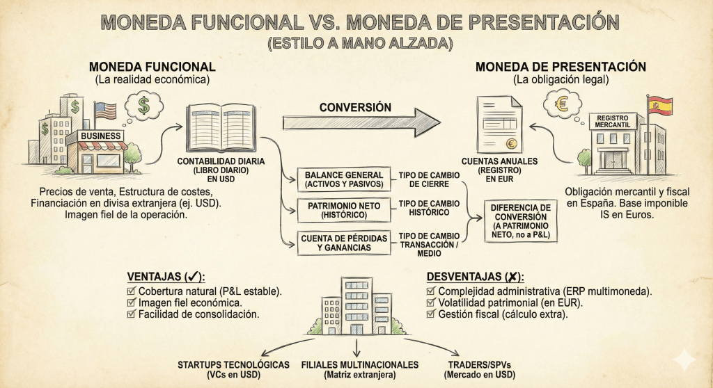 | Facilidad de Consolidación: Si perteneces a un grupo internacional que consolida en USD, facilitas enormemente el trabajo de reporte a la matriz. | Gestión Fiscal: La liquidación de impuestos sigue siendo en Euros, lo que añade una capa extra de cálculo al cierre fiscal. |