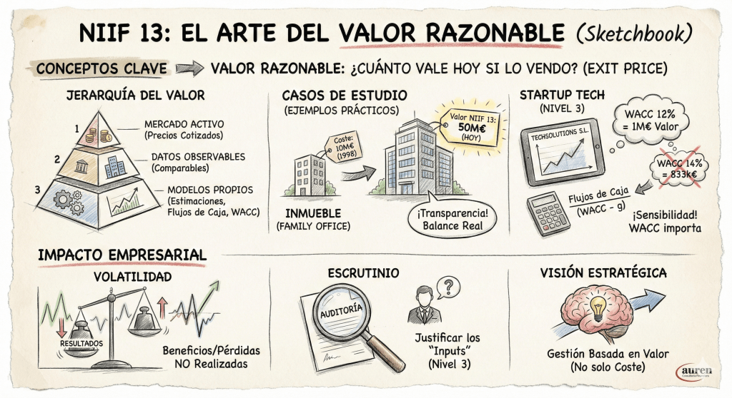 Aquí entra la NIIF 13 (Medición del Valor Razonable). No es una norma que te diga cuándo valorar a valor razonable, sino que establece un marco único sobre cómo hacerlo cuando otra norma lo exige. Para empresas como las que asesoramos en Auren, entender esta norma es vital para reflejar la verdadera imagen fiel del patrimonio.