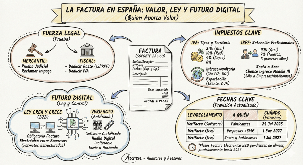 En este artículo repasamos qué da fuerza legal a una factura, cómo gestionar sus impuestos (IVA e IRPF) y, crucialmente, cómo prepararse para los cambios legislativos que se avecinan.