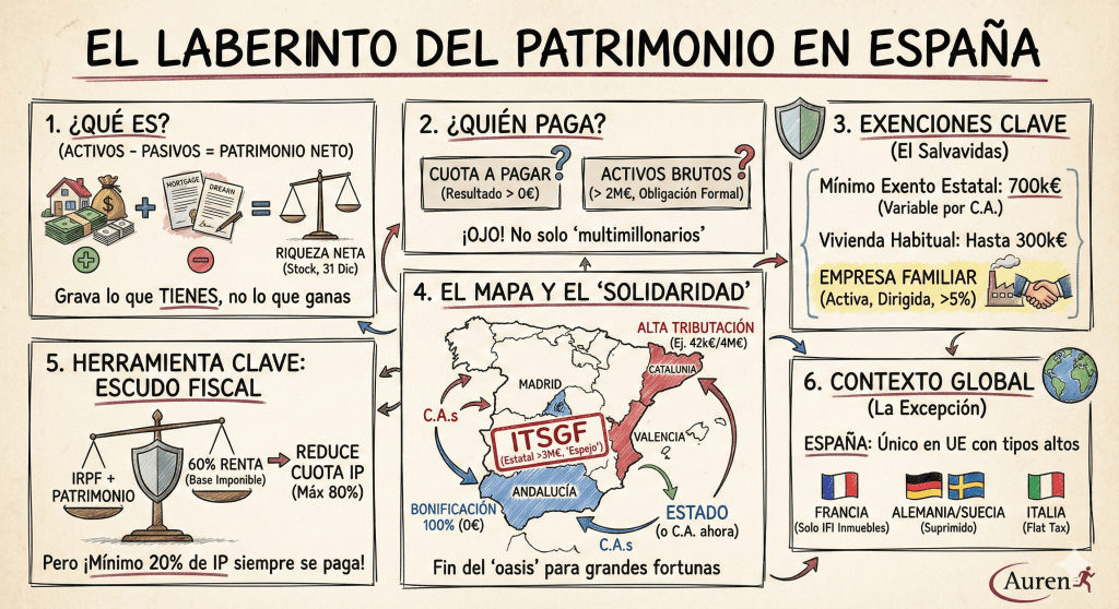 Si hay un tema recurrente en las mesas de reuniones con clientes en Auren, ya sean family offices, empresarios consolidados o altos directivos, es la incertidumbre fiscal. Y dentro de esa incertidumbre, el Impuesto sobre el Patrimonio (IP) se lleva la palma.