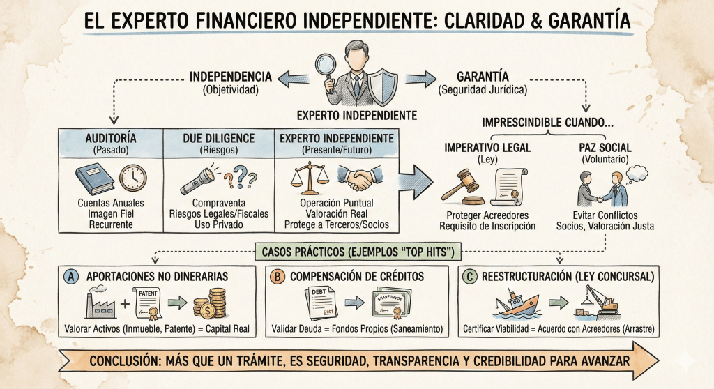 Mientras que la auditoría dice «tus cuentas están bien hechas» y la Due Diligence dice «ten cuidado con estos riesgos si compras», el Experto Independiente dice: «Esta operación es justa y el valor asignado es real».